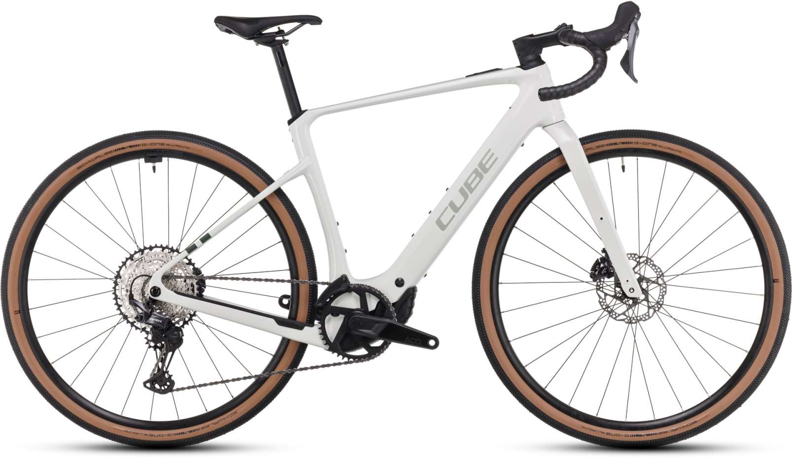 The Cube Nuroad Hybrid C:62’s carbon frame is a gravel style bike with clearance for tyres up to 50mm even with mudguards fitted. There are bike rack mounting points at the rear and on the full carbon fork making the bike ideal for bikepacking. The Bosch drive system uses the Bosch Performance Line SX motor which is one of the lightest motors developed and provides 55nM of torque. The Bosch CompactTube 400 battery is fully integrated into the down tube for optimal weight distribution and handling. The Power More option means you can add an additional 250Wh battery quickly and simply, for extra range. The battery produces 400 watt hours at a weight of only around 2 kilos.